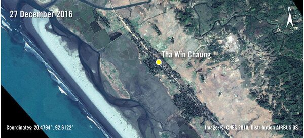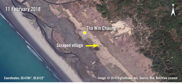 Tha Win Chaung, a Rohingya village in southern Maungdaw Township near Inn Din, was intact prior to the Aug. 25, 2017 attacks (above); then burned, except for surrounding vegetation; and, more recently, cleared away completely, as if the village had never existed (below).Digital Globe
