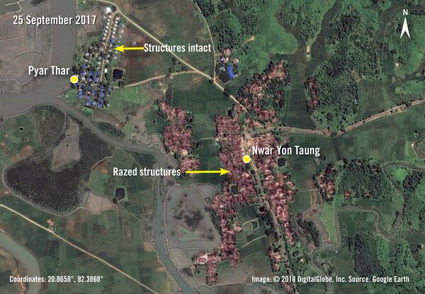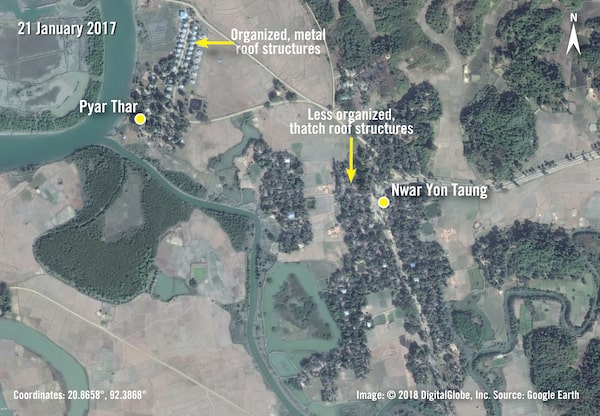 Imagery from Jan. 21, 2017 (above), shows Pyar Thar and Nwar Yon Taung villages, both part of Nwar Yon Taung village tract. Imagery from Sept. 25, 2017 (below), shows the less organized structures have been razed while the more organized, metal roof structures have been left intact.Digital Globe