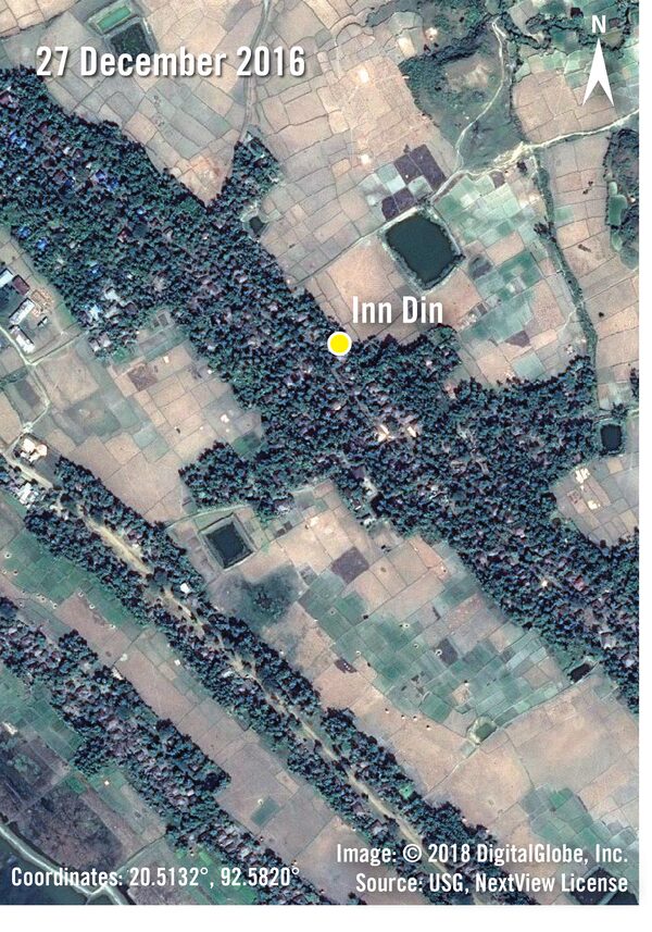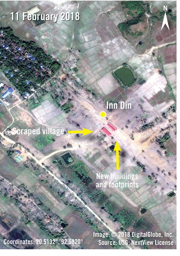 Imagery from Dec. 27, 2016 (above), shows Inn Din, in Maungdaw Township, before the mass burning of villages occurred in August, 2017. On Feb. 11, 2018 (below), much of the southern burned area has been scraped, and two new structures are visible.Digital Globe