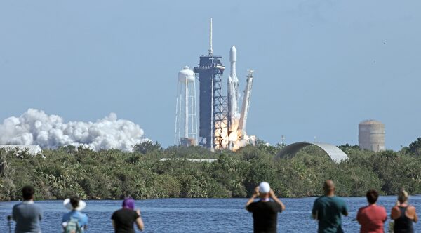 A SpaceX Falcon Heavy rocket with the Europa Clipper spacecraft aboard launches from Launch Complex 39A at NASA's Kennedy Space Center in Cape Canaveral on Oct. 14, 2024.GREGG NEWTON/AFP/Getty Images