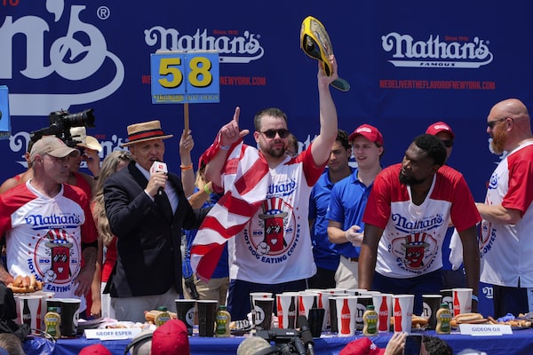 Patrick Bertoletti of Chicago gobbled down 58 hot dogs to win his first men’s title Thursday at the annual Nathan’s Famous Fourth of July hot dog eating contest, taking advantage of the absence of the event’s biggest star.