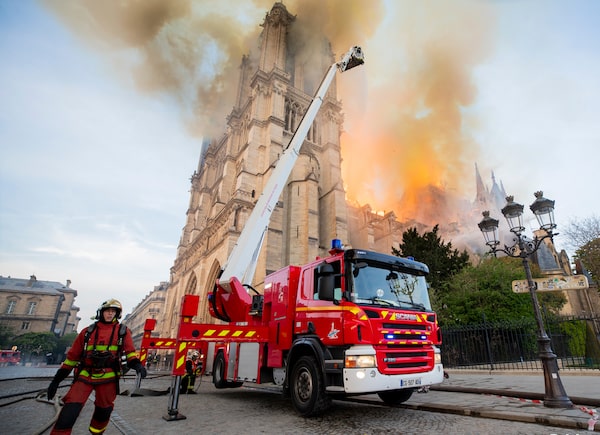 This Tuesday April 16, 2019 photo by the Paris Fire Brigade shows fire fighters working at the burning Notre Dame cathedral, Monday April 15, 2019. Experts assessed the blackened shell of Paris' iconic Notre Dame Tuesday morning to establish next steps to save what remains after a devastating fire destroyed much of the cathedral that had survived almost 900 years of history. (Benoit Moser, BSPP via AP)Benoit Moser/The Associated Press