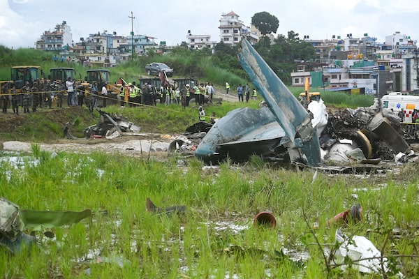 Army personnel and other officials stand around the debris of a Saurya Airlines plane after it crashed during takeoff at Tribhuvan International Airport in Kathmandu on July 24.PRAKASH MATHEMA/Getty Images