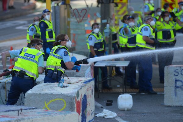 Police use jets of water as they move in to clear protesters near parliament, in Wellington, New Zealand, on March 2.DAVE LINTOTT/AFP/Getty Images