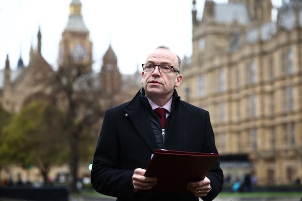Britain's Northern Ireland Secretary Chris Heaton-Harris speaks to the press on College Green in London on Jan. 30.HENRY NICHOLLS/Getty Images