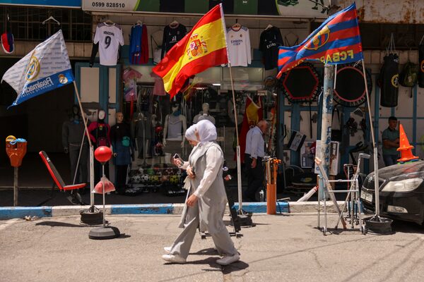 A sports supply shop displays flags of Spain in its window in the city center of Hebron in the occupied West Bank on May 22.HAZEM BADER/Getty Images