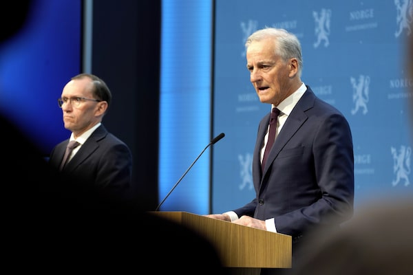 Norway's Prime Minister Jonas Gahr Store, right, with Foreign Minister Espen Barth Eide, speaks during a news conference in Oslo, Norway, on May 22.Erik Flaaris Johansen/The Associated Press