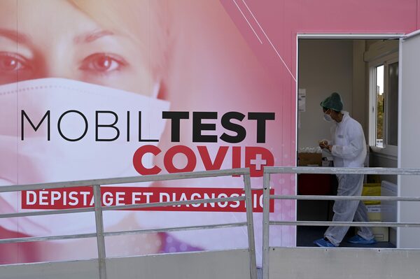 A health worker is seen inside a mobile COVID-19 screening facility set up at the main train station in Marseille, southern France, on Nov. 12, 2020.NICOLAS TUCAT/AFP/Getty Images