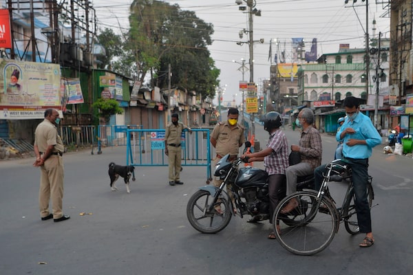 Police personnel inspect people along a street during a government-imposed nationwide lockdown as a preventive measure against the COVID-19 coronavirus, in Siliguri, India on April 3, 2020.DIPTENDU DUTTA/AFP/Getty Images