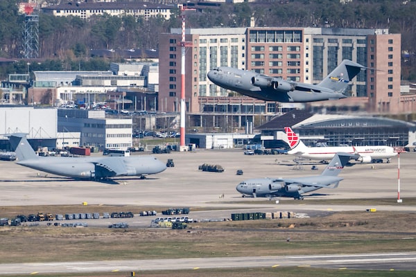 A U.S. Air Force cargo plane takes off from Ramstein Air Base in Germany on Thursday. The base is a major transit hub for U.S. troops and materiel deployed to the Middle East. While U.S. President Donald Trump has said the current U.S.-Israeli war with Iran should cease in a matter of weeks, the number of U.S. ground troops being sent to the region has recently increased significantly.Thomas Lohnes/Getty Images