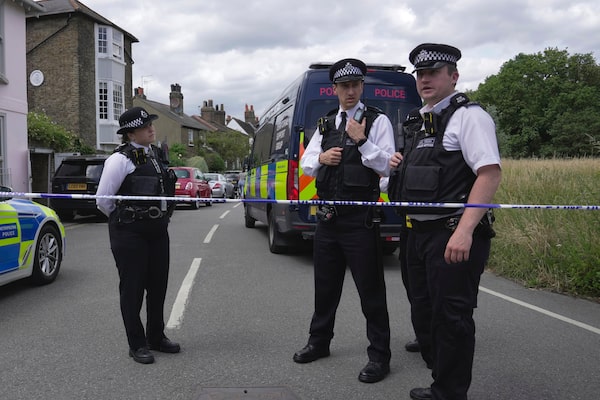 Police officers set up cordon line after a car crashed into a primary school building in Wimbledon, London, on July 6.Kin Cheung/The Associated Press
