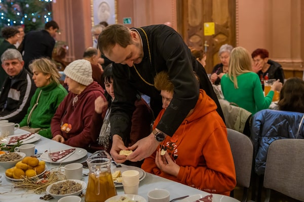 Above, Orthodox priest Jerzy Mokrauz breaks wishing bread with a woman. A group of around 100 Ukrainian refugees gathered Friday at Ukrainian House in Przemysl, Poland, for a traditional Orthodox Christmas Eve dinner.Anna Liminowicz/The Globe and Mail