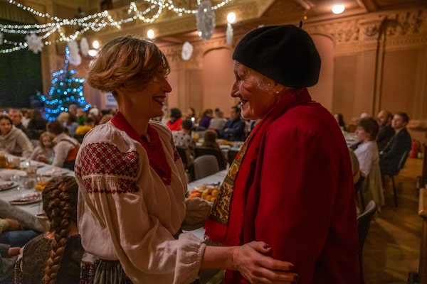 Tatiana Nakonieczna, left, a volunteer at Ukrainian House in Przemysl, Poland, greets a refugee from Ukraine at a traditional Orthodox Christmas Eve dinner the centre organized on Friday.Anna Liminowicz/The Globe and Mail