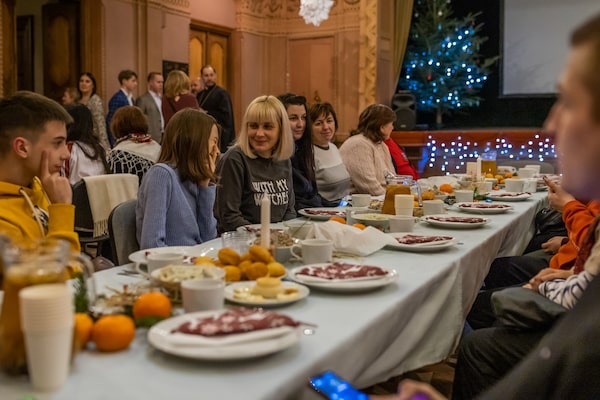 Yana Avramova, middle, and her two teenage children, who all recently arrived from Odesa, join other refugees at Ukrainian House in Przemysl, Poland, on Friday for a traditional Orthodox Christmas Eve dinner.Anna Liminowicz/The Globe and Mail