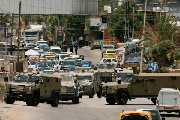 Traffic is blocked as Israeli army vehicles close off the entrance to the West Bank city of Qalqilya after an Israeli civilian was shot and killed on June 22.JAAFAR ASHTIYEH/Getty Images
