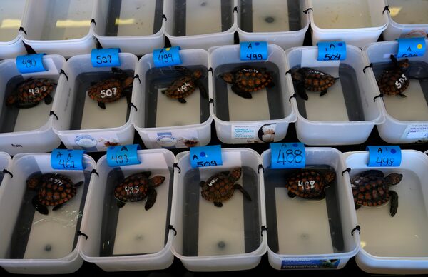 The turtles are ranked according to how sick they are, with some needing intensive care due to injuries, malnutrition or infection. A number is written on each shell to identify them.