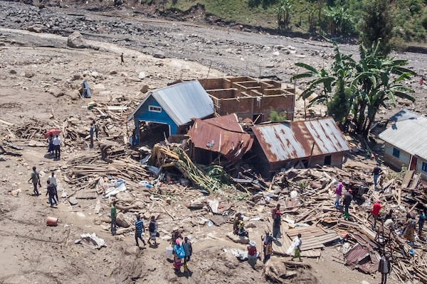 Survivors walk amidst debris next to destroyed buildings in the aftermath of floods in the village of Nyamukubi, South Kivu province, in Congo, on May 8.Justin Kabumba/The Associated Press
