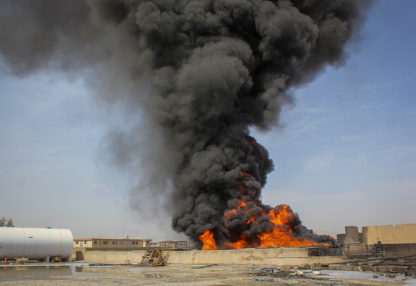 Smoke rises at the private airline Kam Air's fuel depot after what the Taliban said was a Pakistani air strike, in Kandahar, Afghanistan, on Friday.Stringer/Reuters