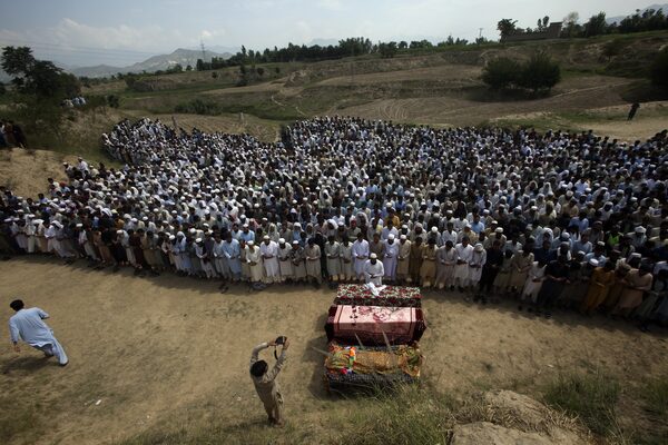 Relatives and mourners attend the funeral prayer of victims who were killed in Sunday's suicide bomber attack in the Bajur district of Khyber Pakhtunkhwa, Pakistan, on July 31.Mohammad Sajjad/The Associated Press