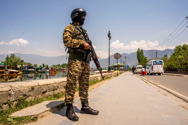 An Indian paramilitary soldier stands alert on the bank of Dal lake, amid heightened tensions following a deadly attack in Pahalgam that killed 26 tourists, on April 26, in Srinagar, India.Yawar Nazir/Getty Images