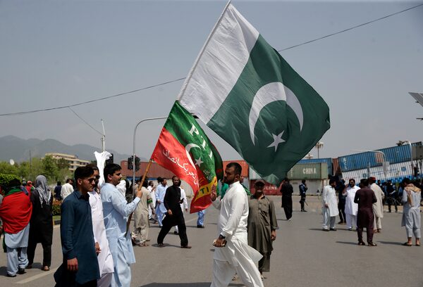 Supporters of ruling party Pakistan Tehreek-e-Insaf (PTI) hold the national flag during a protest in Islamabad, Pakistan, on April 3, 2022. Pakistan's embattled Prime Minister Imran Khan said Sunday he will seek early elections after sidestepping a no-confidence challenge and alleging that a conspiracy to topple his government had failed.Rahmat Gul/The Associated Press
