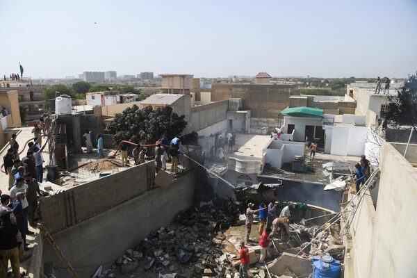 The plane went down about 2:39 p.m. northeast of Jinnah International Airport in the poor and congested residential area known as Model Colony between houses that were smashed by its wings. Police in protective masks struggled to clear away crowds amid the smoke and dust so ambulances and fire trucks could reach the crash site.