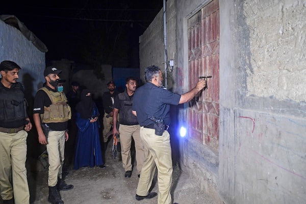 Police personnel conduct a late night search operation to gather Afghan refugees allegedly living illegally, in the outskirts of Karachi on Nov. 11, 2023.ASIF HASSAN/AFP/Getty Images
