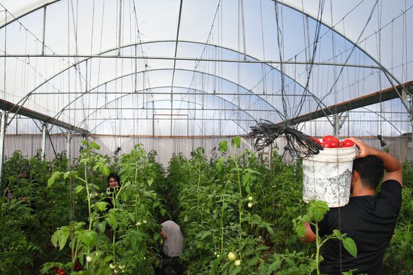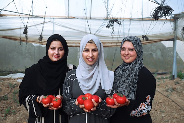Aseel Kamal, Ghaidaa Qudaih and Nadin Akram – known collectively as the Green Girls – pick tomatoes at their greenhouse east of Khan Yunis in the Gaza Strip.