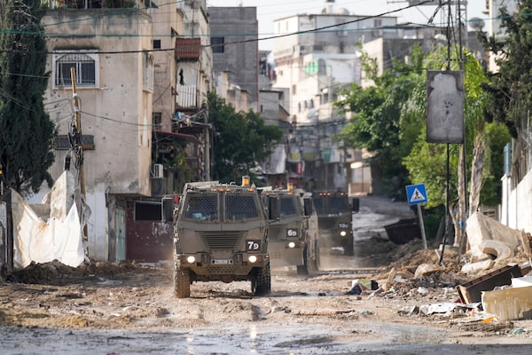 Israeli military vehicles are seen in the town of Tulkarem, West Bank, on Nov. 22, 2023. Palestinian militants in Tulkarem refugee camp shot and killed two alleged collaborators with Israel early Saturday, Palestinian officials said.Majdi Mohammed/The Associated Press