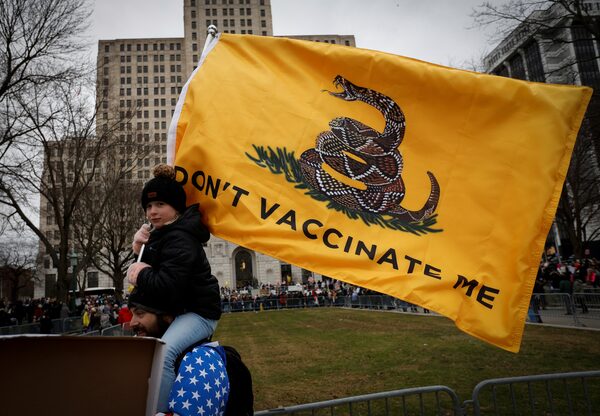 A child on a man's shoulders holds a banner at a rally against mandates for the vaccines outside the New York State Capitol in Albany on Jan. 5.MIKE SEGAR/Reuters