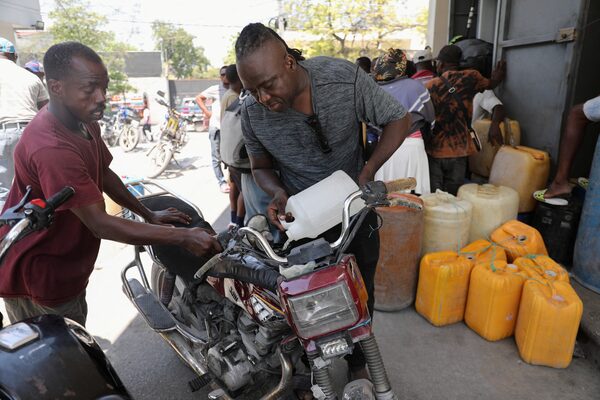 A man fills the tank of a motorcycle at a petrol station as violence spreads and armed gangs expand their control over Haiti's capital, Port-au-Prince, on March 29.Ralph Tedy Erol/Reuters