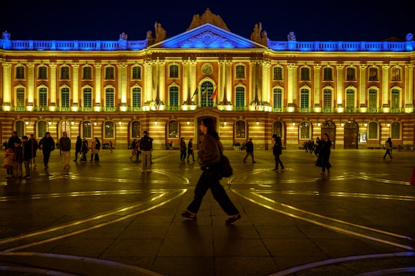 The Place du Capitole is illuminated in the colours of the Ukrainian flag to mark the second anniversary of Russia's invasion, in Toulouse, France, on Feb. 24.ED JONES/Getty Images