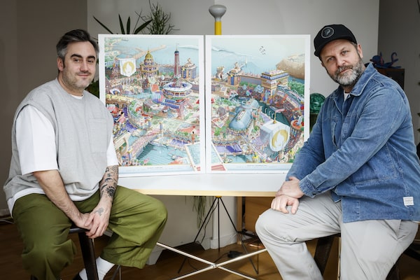 French artist Hugo Gattoni, left, and head of design for Paris 2024, Joachim Roncin pose next to the Paris 2024 Olympic and Paralympic posters in Ivry-sur-Seine outside Paris, on Feb. 20, 2024. Vibrant colors and striking landmarks illuminate posters for the Paris Olympic Games in an Art Deco style inspired by the city's flamboyant past. The posters have been unveiled at the Musée d'Orsay.Thomas Padilla/The Associated Press