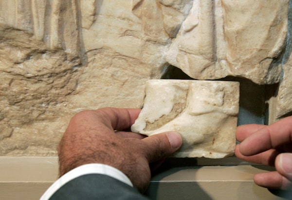 George Voulgarakis, then Greece's culture minister, puts a Parthenon fragment into place in 2006 after its return from Germany.Yiorgos Karahalis/Reuters