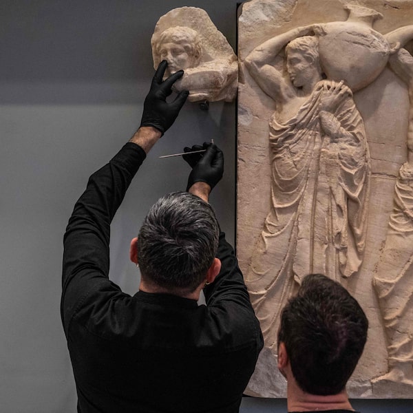 Curators put one of the fragments into place.ANGELOS TZORTZINIS/AFP via Getty Images
