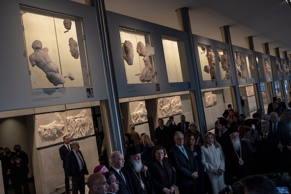 Delegates take part in a March 24 ceremony at the Acropolis Museum for the repatriation of Parthenon fragments from the Vatican.Petros Giannakouris/The Associated Press