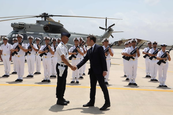 March 12, 2019: French President Emmanuel Macron reviews the troops on a visit to France's military base in Djibouti.LUDOVIC MARIN/AFP/Getty Images