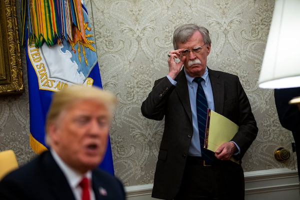 National security adviser John Bolton looks on as U.S. President Donald Trump holds a meeting in the Oval Office.Al Drago/The New York Times