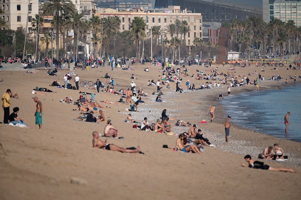 People sunbathe on the San Sebastian beach in Barcelona as temperatures around 30°C were recorded in Spain, on Jan. 26.JOSEP LAGO/Getty Images