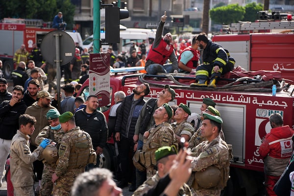 Lebanese army soldiers and first responders look up at an Israeli drone flying overhead at the site of an Israeli air strike in Beirut on Wednesday.Emilio Morenatti/The Associated Press