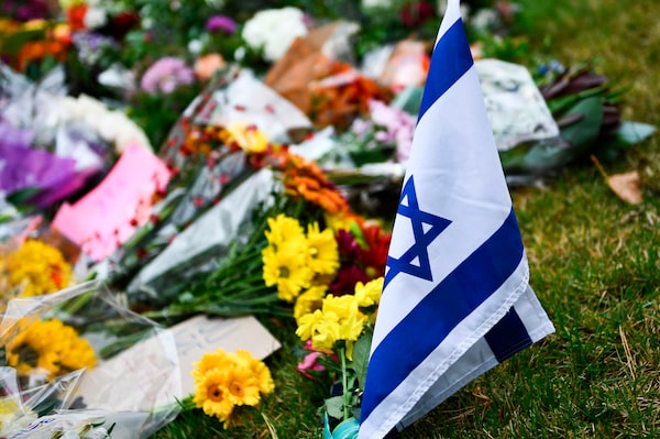 Oct. 28: An Israeli national flag is seen at a memorial down the road from the Tree of Life synagogue in Pittsburgh.BRENDAN SMIALOWSKI/AFP/Getty Images