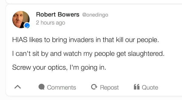 This image shows a portion of an archived webpage from the social media website Gab, with an Oct. 27 posting by Mr. Bowers.The Canadian Press