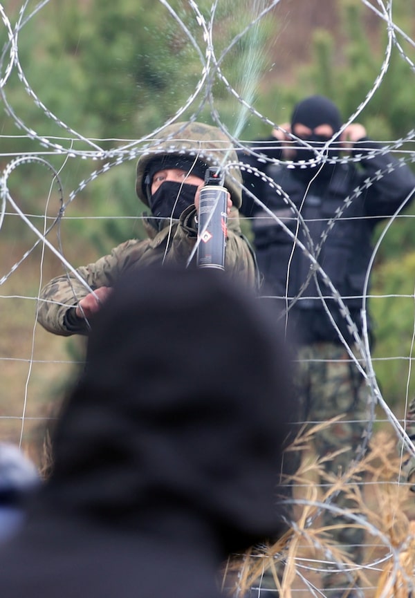 A member of Polish security forces sprays liquid through the border fence.Leonid Scheglov/BelTA/Handout via REUTERs
