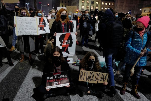 Demonstrators hold placards during a protest following the ruling by Poland's Constitutional Tribunal that imposes a near-total ban on abortion, in Warsaw, on Nov. 2, 2020.KACPER PEMPEL/Reuters