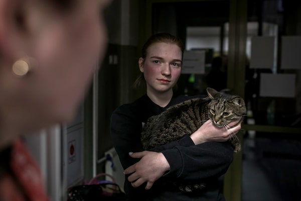 Daryona Solodka holds cat Ostap Bender at the school in Przemysl.