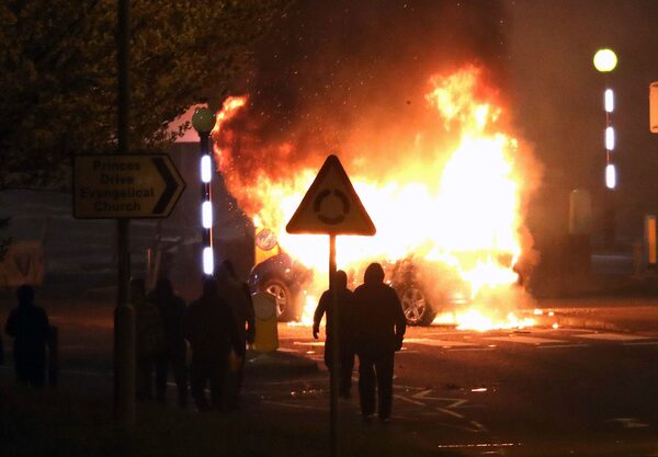 A car is set on fire at the Cloughfern roundabout in Newtownabbey, Belfast, Northern Ireland, on April 3, 2021.Peter Morrison/The Associated Press
