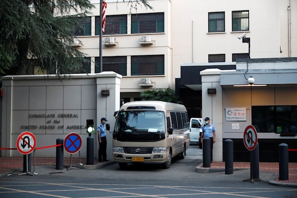 A vehicle leaves the U.S. Consulate General in Chengdu, Sichuan province, China, on July 26, 2020.THOMAS PETER/Reuters