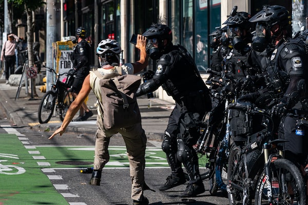 Carrying signs such as “Feds Go Home” and shouting chants of “No justice, no peace,” some among the crowd of about 5,000 protesters stopped at a youth detention centre and lit several construction trailers there on fire. Some smashed windows of nearby businesses, ignited a fire in a coffee shop and blew an eight-inch hole through the wall of the Seattle Police Department’s East Precinct building, the police said.
