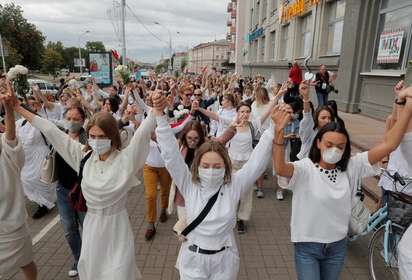 Earlier in the day, groups of hundreds of women formed human chains in several districts of Minsk, chanting “Shame!” and calling for an end to the crackdown on the demonstrations. Hesitant to use force against all-women rallies, police dispersed them without violence.