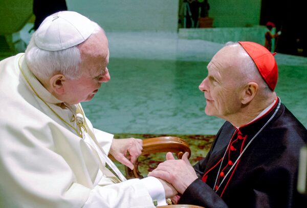 In this Feb. 23, 2001, file photo, U.S. Cardinal Theodore McCarrick shakes hands with Pope John Paul II at the Vatican.Massimo Sambucetti/The Associated Press